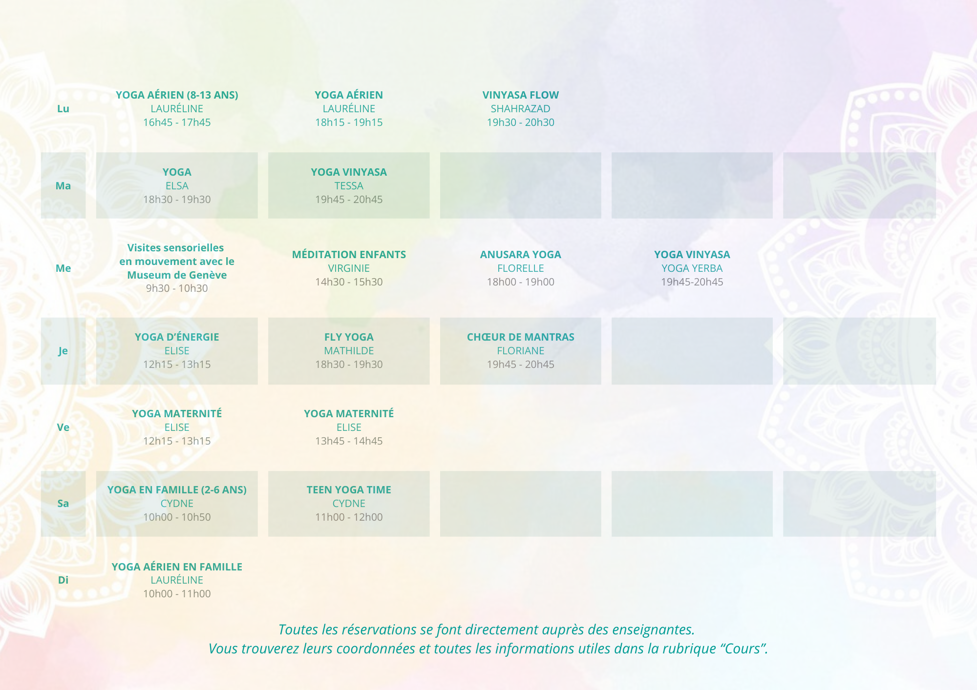 Des cours de yoga pour tous les âges sont proposés sur la base d’un planning hebdomadaire. Que vous ayez 8 ou 88 ans, que vous soyez débutant ou que vous pratiquiez déjà de manière avancée, vous trouverez certainement le professeur de yoga qui vous correspond parmi nos enseignants.