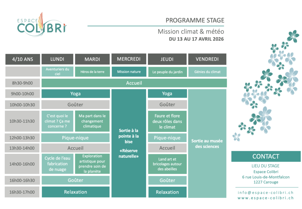 Du 13 au 17 avril, nous accueillerons vos enfants âgés de 4 à 10 ans pour une semaine de découverte et de développement personnel à travers notre stage de vacances à Genève.